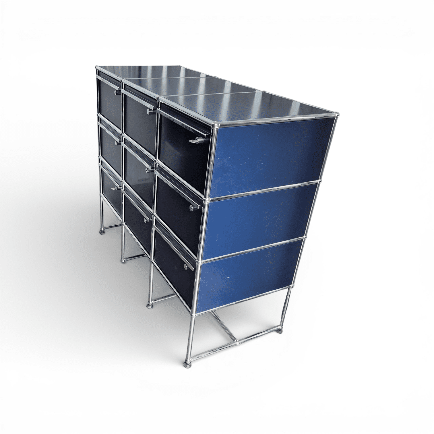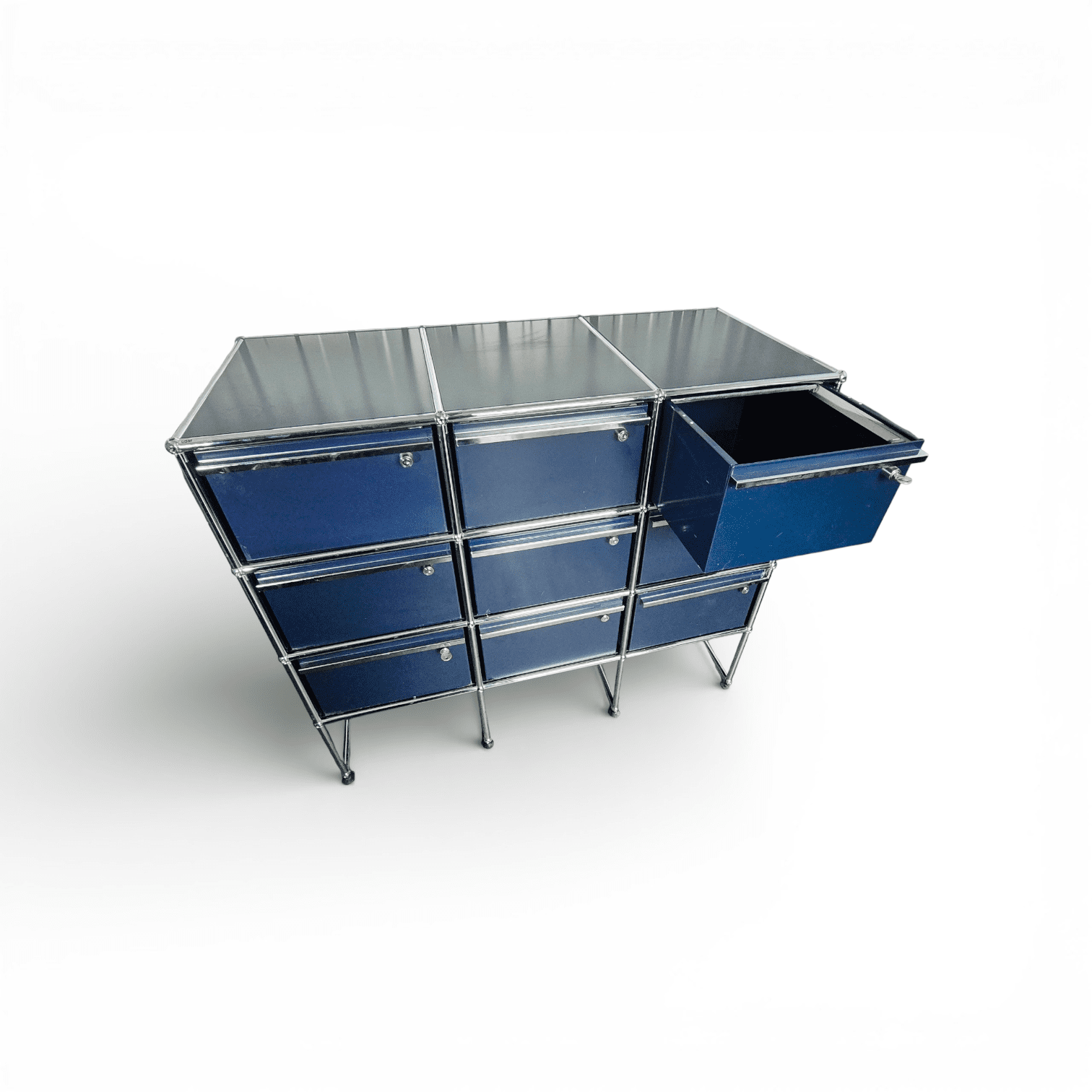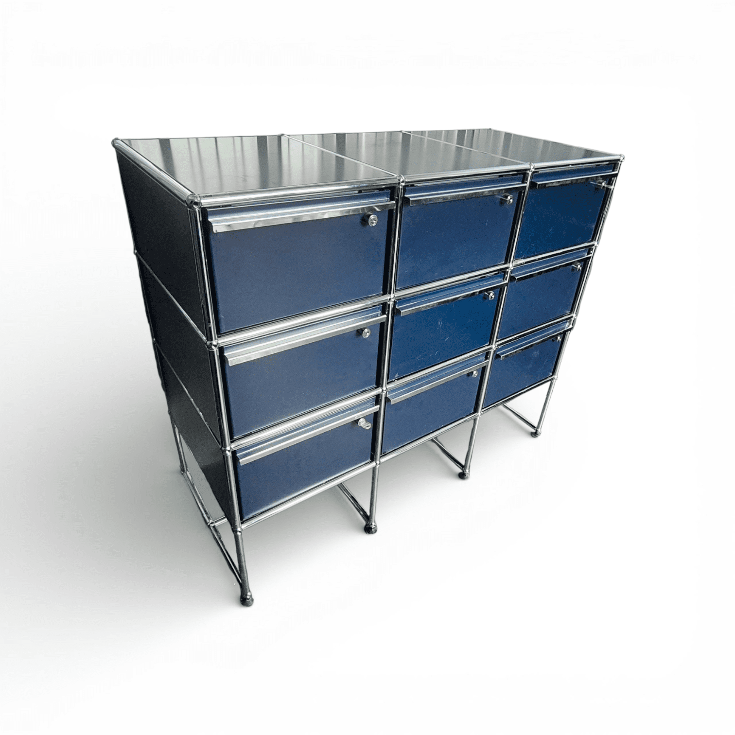 Stahlblau ist keine Alltagsfarbe — und dieses Highboard ist kein Alltagsmöbel. Wer gezielt nach einem USM Haller in dieser Ausführung sucht, weiß: Stahlblau (RAL 5011) wird seltener angeboten als Reinweiß oder Graphitschwarz, ist dabei aber die ausdrucksstärkste Farbe im gesamten USM-Sortiment — präsent genug, um einen Raum zu definieren, zurückhaltend genug, um nicht zu dominieren. Neupreis für diese Konfiguration: ca. 4.990,00€ — hier für 2.990,00€.