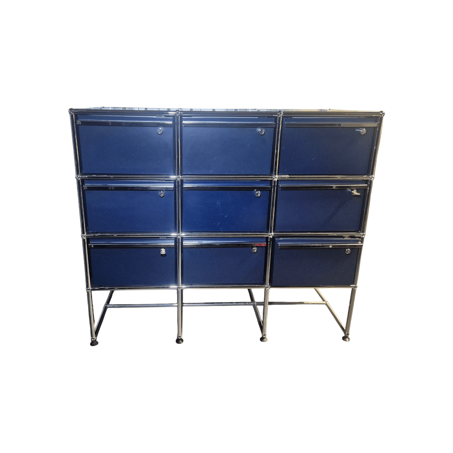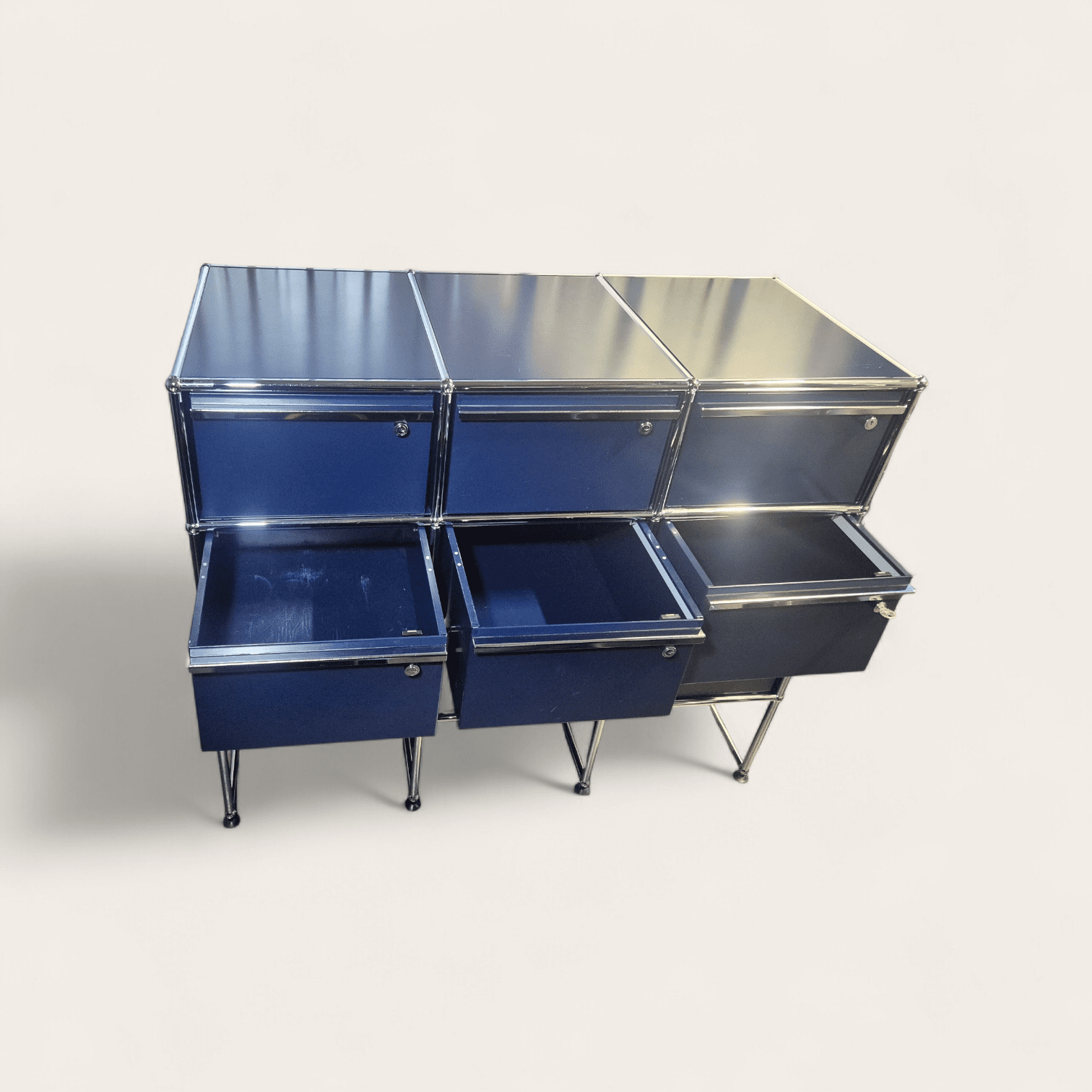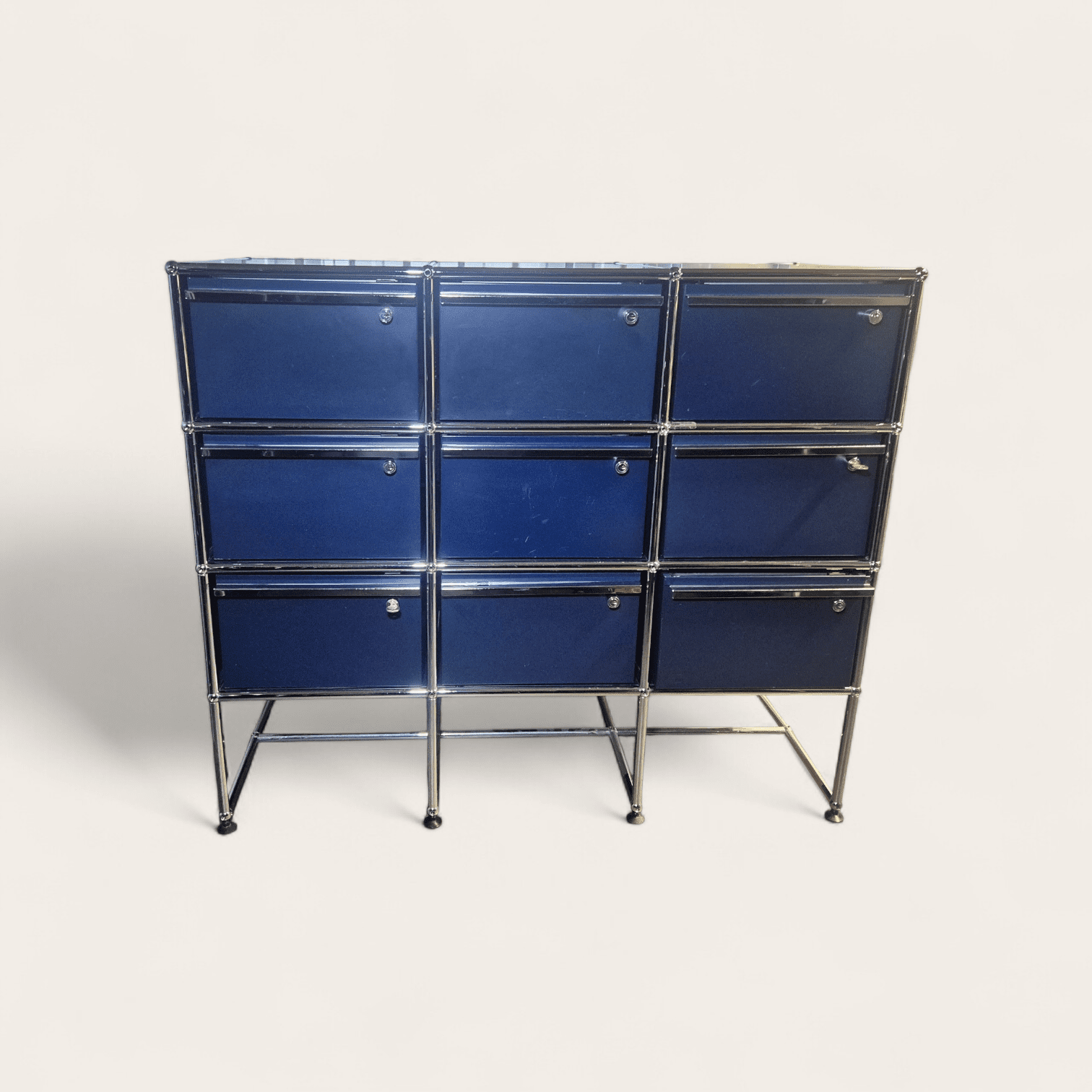 Stahlblau ist keine Alltagsfarbe — und dieses Highboard ist kein Alltagsmöbel. Wer gezielt nach einem USM Haller in dieser Ausführung sucht, weiß: Stahlblau (RAL 5011) wird seltener angeboten als Reinweiß oder Graphitschwarz, ist dabei aber die ausdrucksstärkste Farbe im gesamten USM-Sortiment — präsent genug, um einen Raum zu definieren, zurückhaltend genug, um nicht zu dominieren. Neupreis für diese Konfiguration: ca. 4.990,00€ — hier für 2.990,00€.