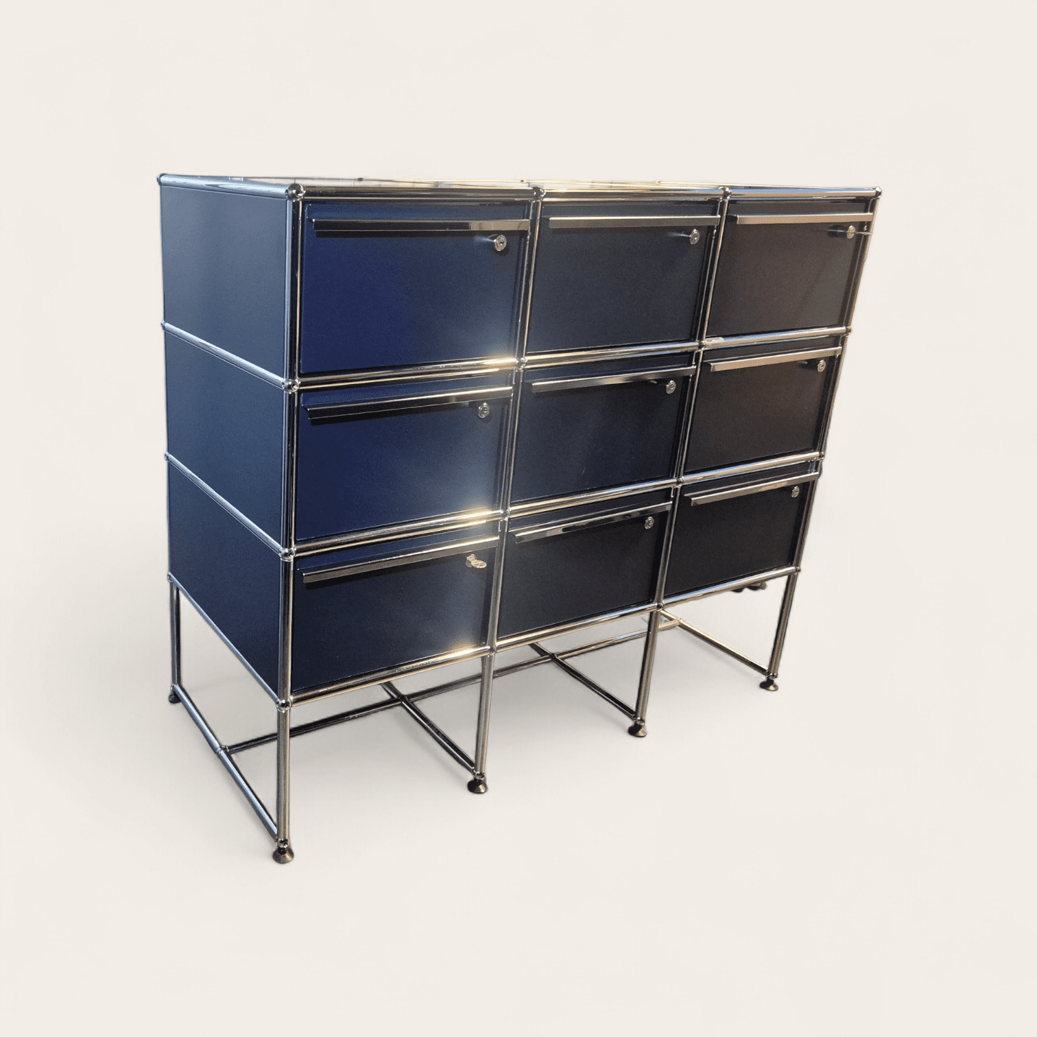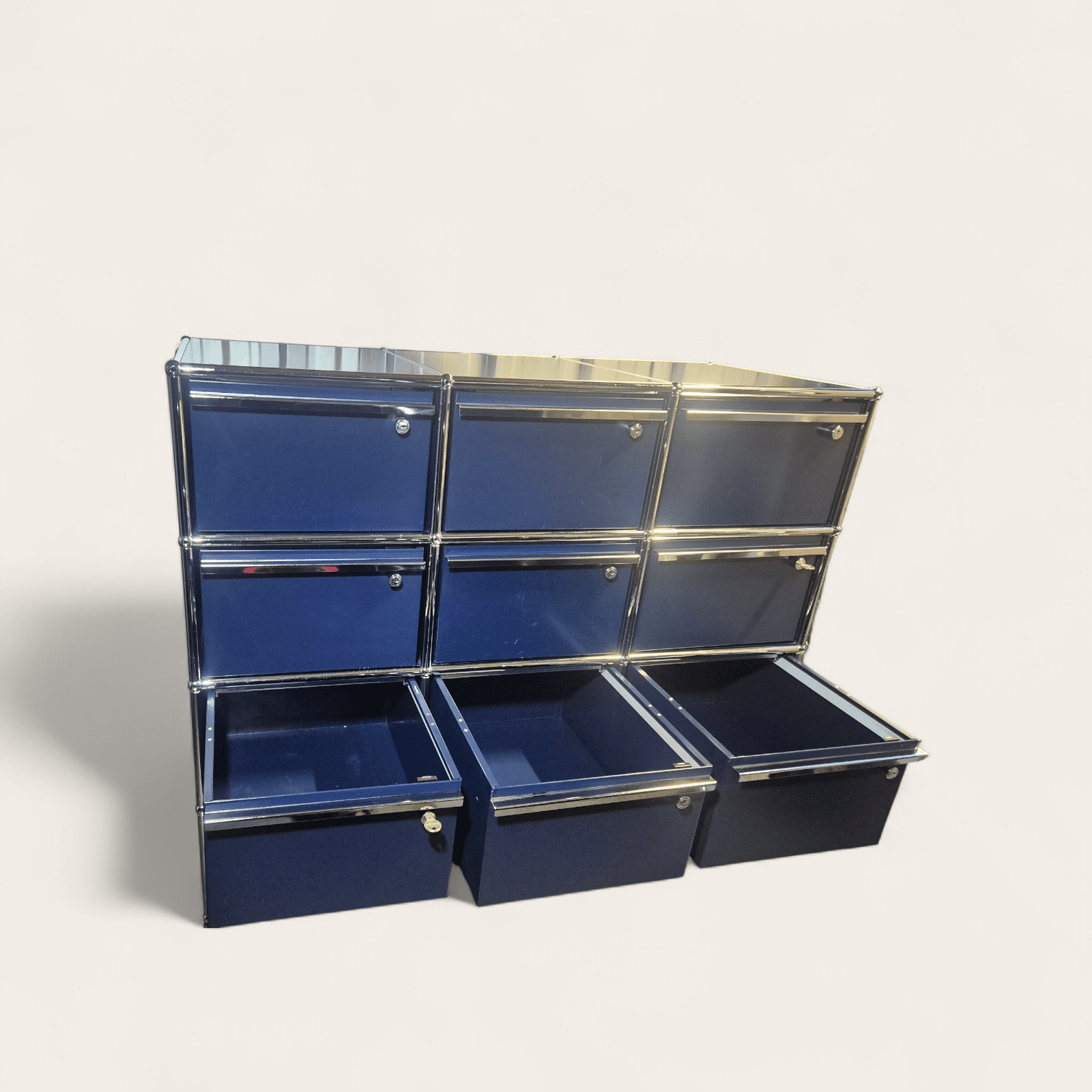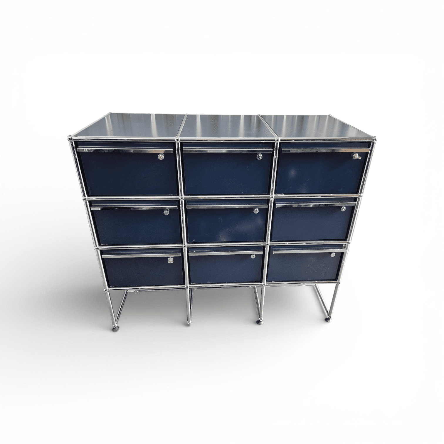Das USM Haller System entstand 1963, als der Schweizer Architekt Fritz Haller gemeinsam mit Paul Schärer ein Möbelsystem entwickelte, das Architektur und Einrichtung als eine Einheit dachte. Das Prinzip — verchromte Stahlrohre, verbunden durch die charakteristischen Messingkugelgelenke — erlaubt nahezu unbegrenzte Konfigurationen, die sich auch Jahrzehnte später noch erweitern oder umbauen lassen. Das Museum of Modern Art in New York nahm das System in seine ständige Sammlung auf. Neun Schubladen, davon drei abschließbar: diese Konfiguration ist besonders praxistauglich für Büros, Kanzleien oder Praxen — und hält dabei, was das Design verspricht.