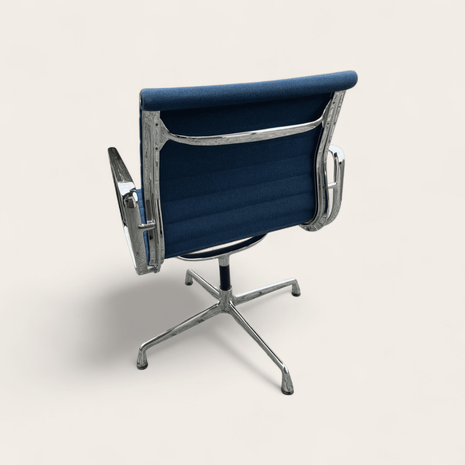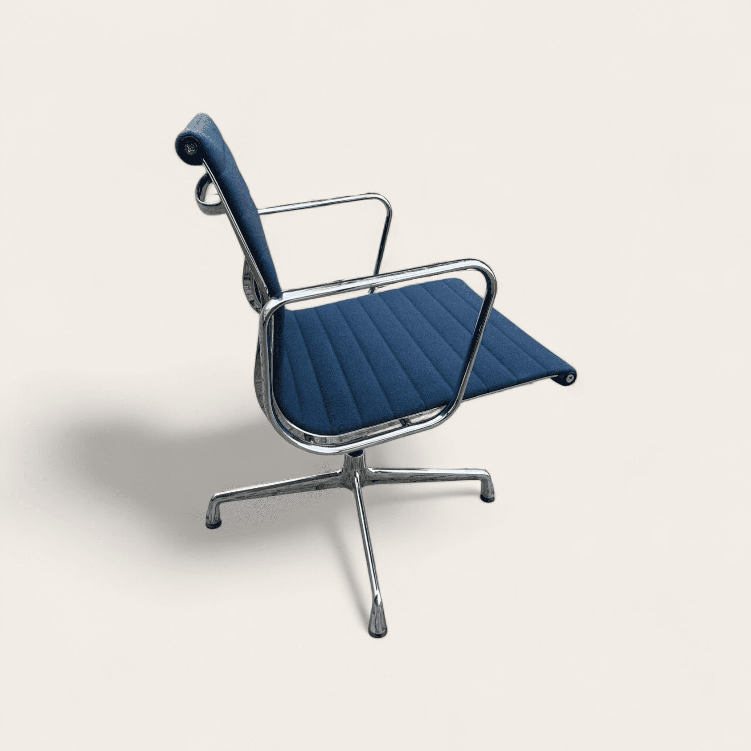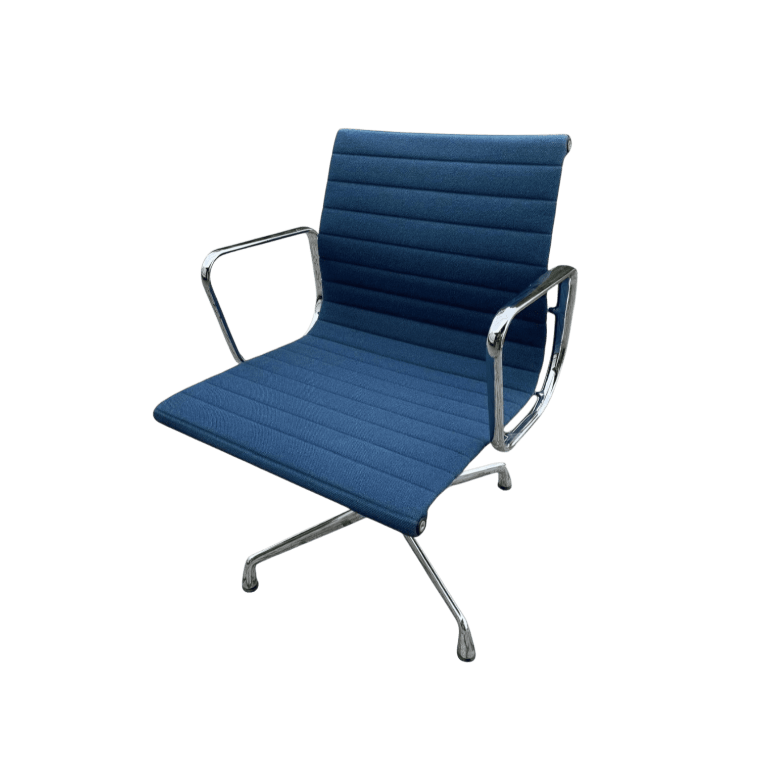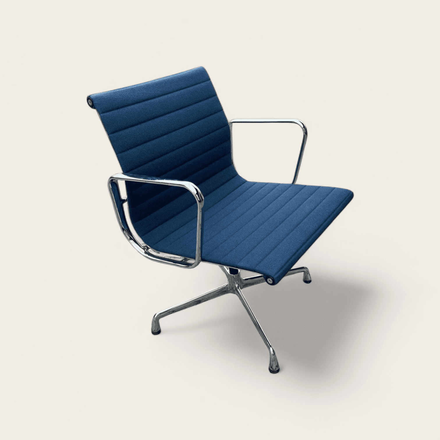 Charles und Ray Eames entwickelten den Aluminium Chair 1958 ursprünglich für ein privates Anwesen in Columbus, Indiana — entworfen im Auftrag ihres Freundes, des Architekten Eero Saarinen. Das Konstruktionsprinzip war radikal: Statt einer Sitzschale wird ein Stoff- oder Ledergewebe zwischen zwei gegossenen Aluminium-Seitenholmen aufgespannt — der Bezug ist kein Überzug, sondern tragender Teil der Konstruktion. Das Ergebnis ist ein Stuhl, der sich dem Körper anpasst, ohne aufwendige Polsterung zu benötigen. Vitra produziert den EA 108 seit Jahrzehnten in unveränderter Qualität und gewährt 30 Jahre Garantie auf alle nicht verschleißrelevanten Teile.