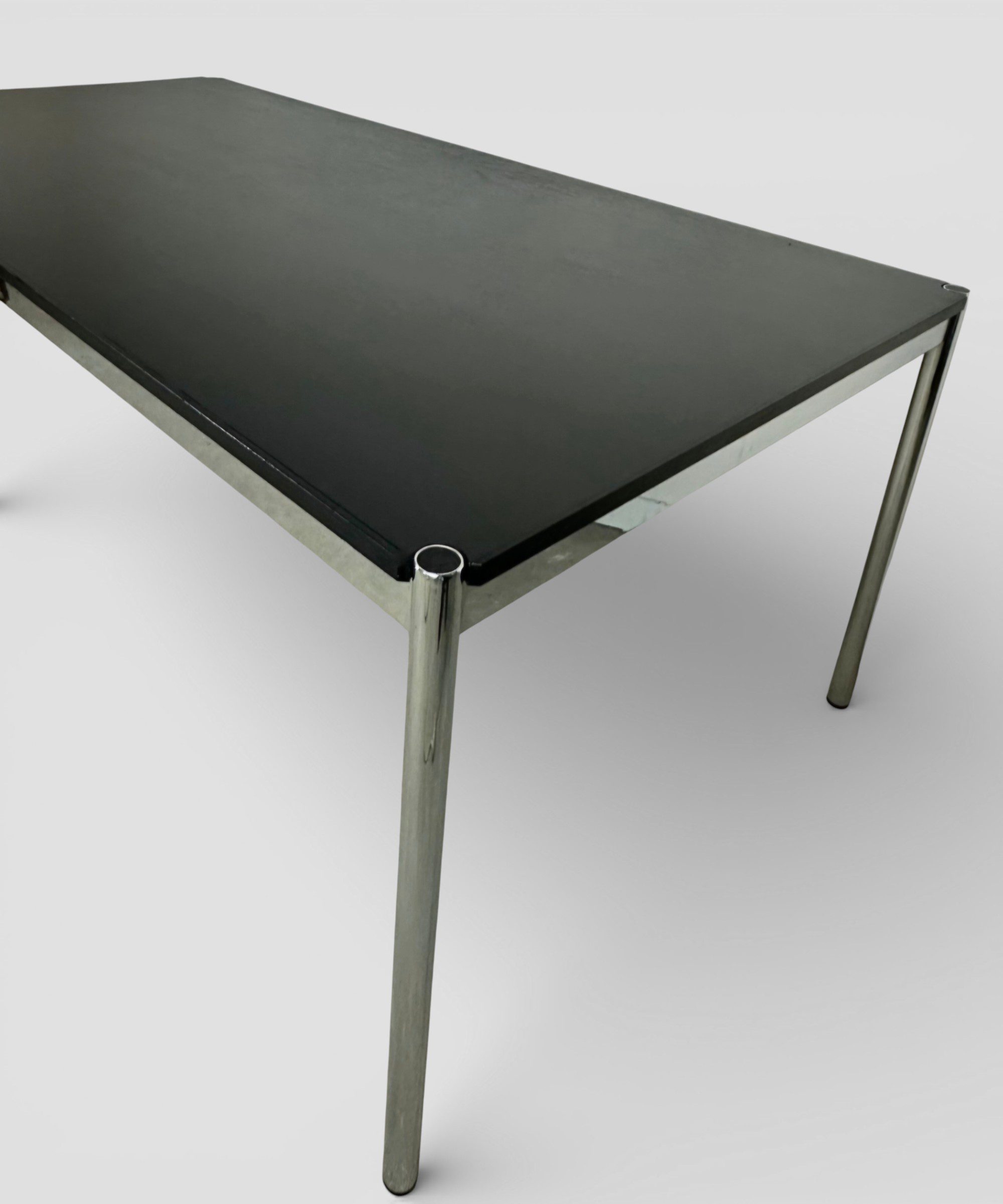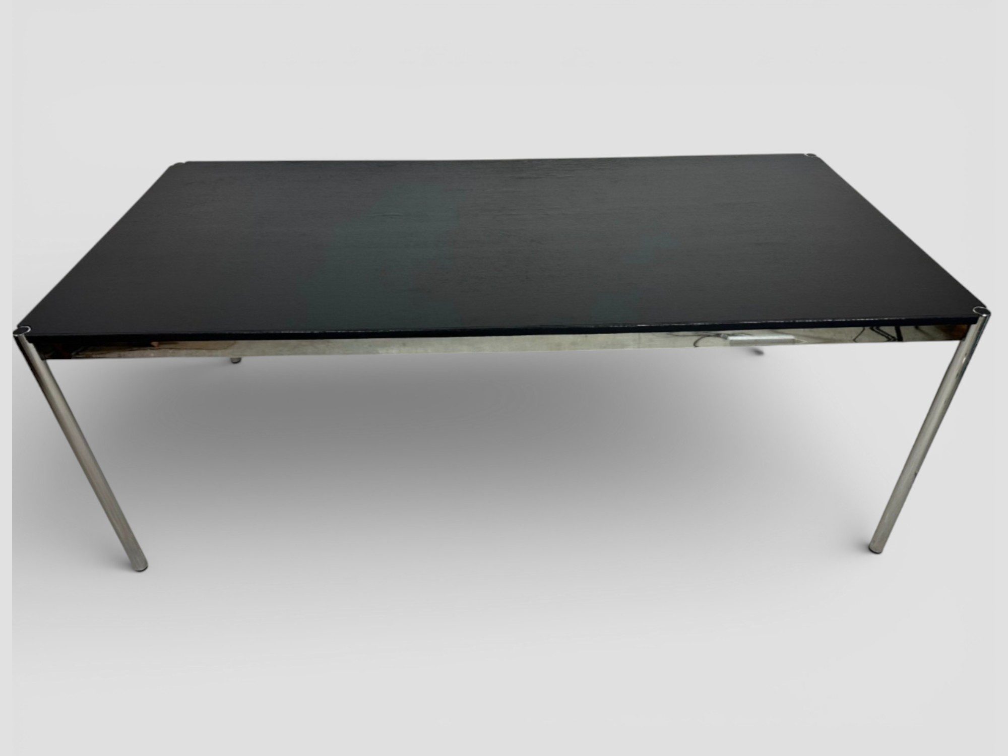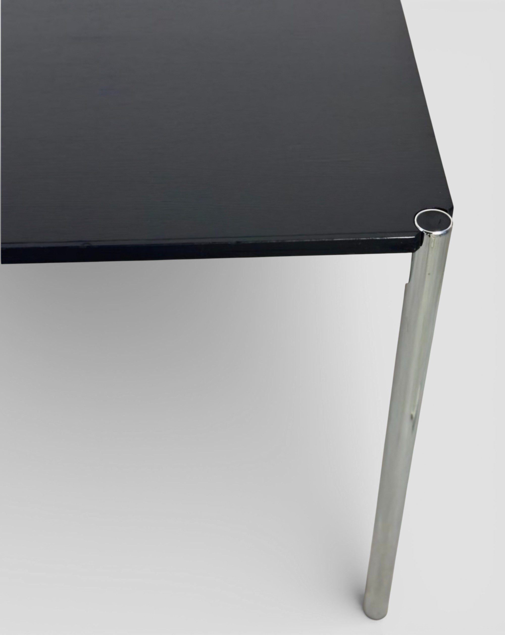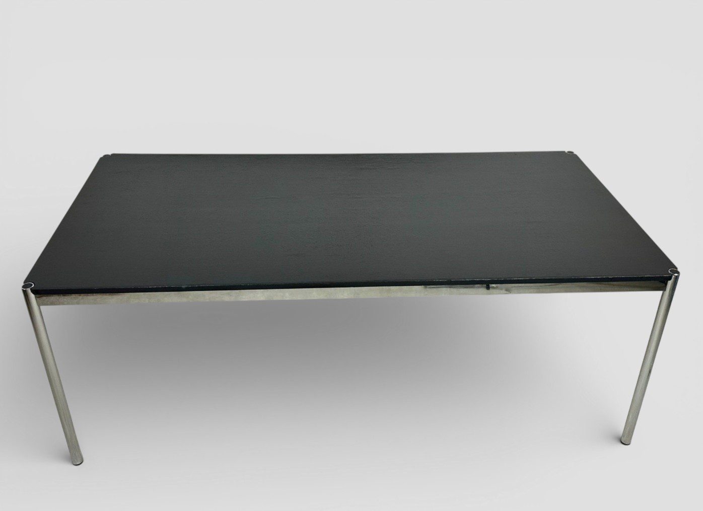 Schwarzes Eichefurnier auf verchromtem Stahlgestell — eine der elegantesten Ausführungen, die USM für diesen Tisch anbietet. Neupreis bei USM Haller liegt aktuell bei ca. €1.905 — hier für €590, das entspricht einer Ersparnis von über €1.300.