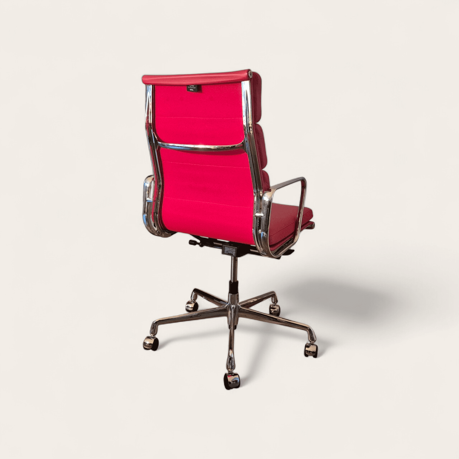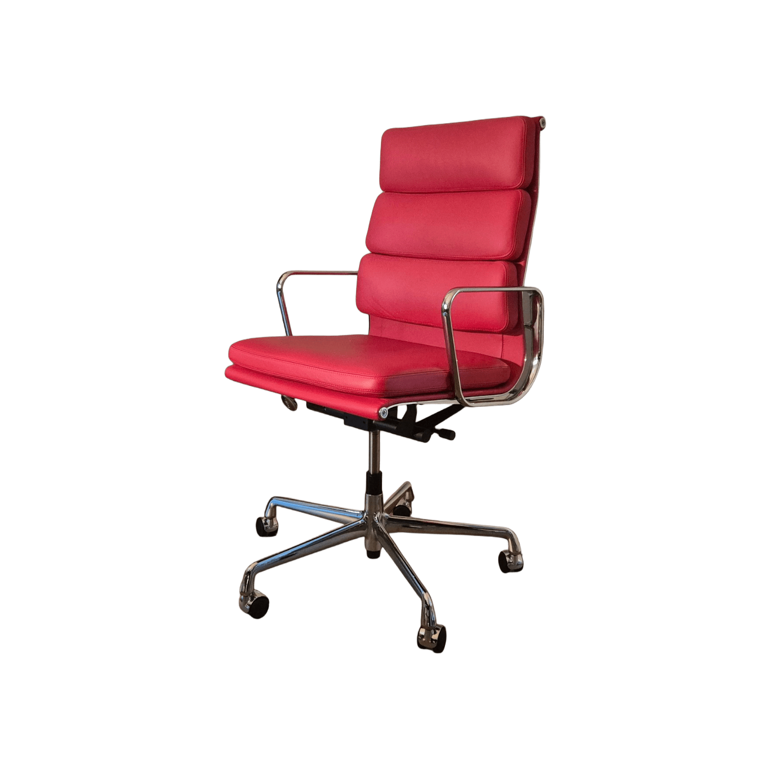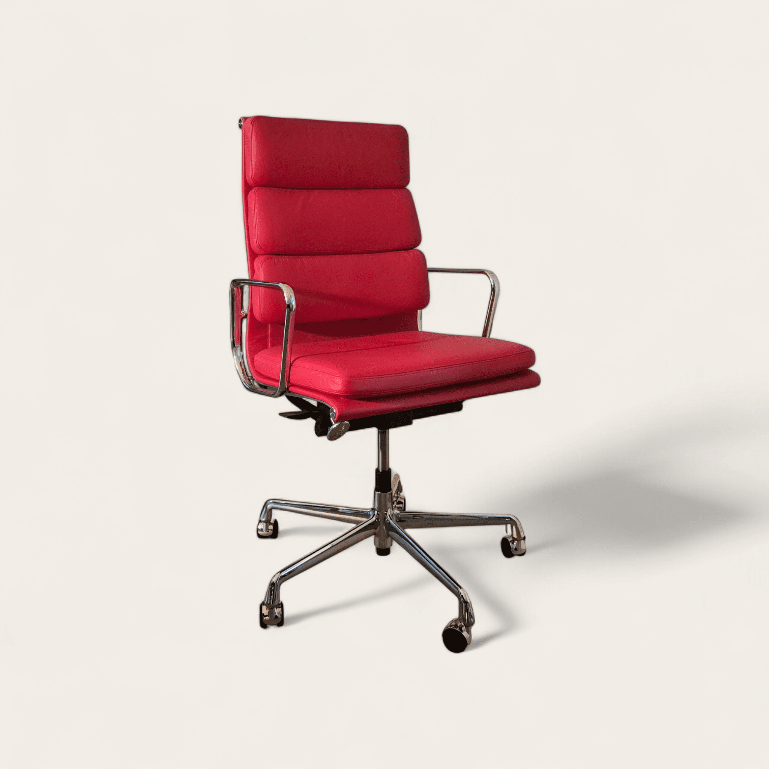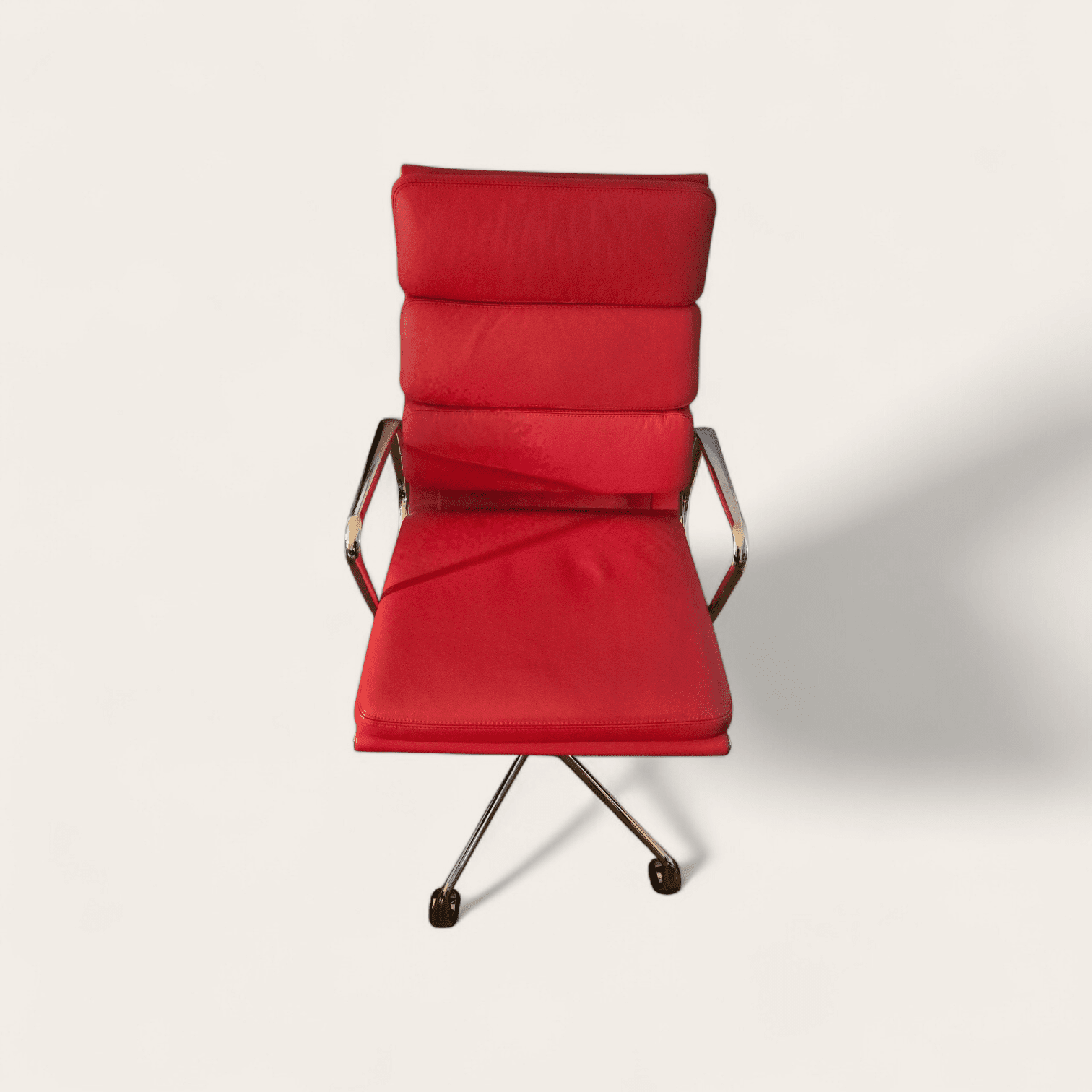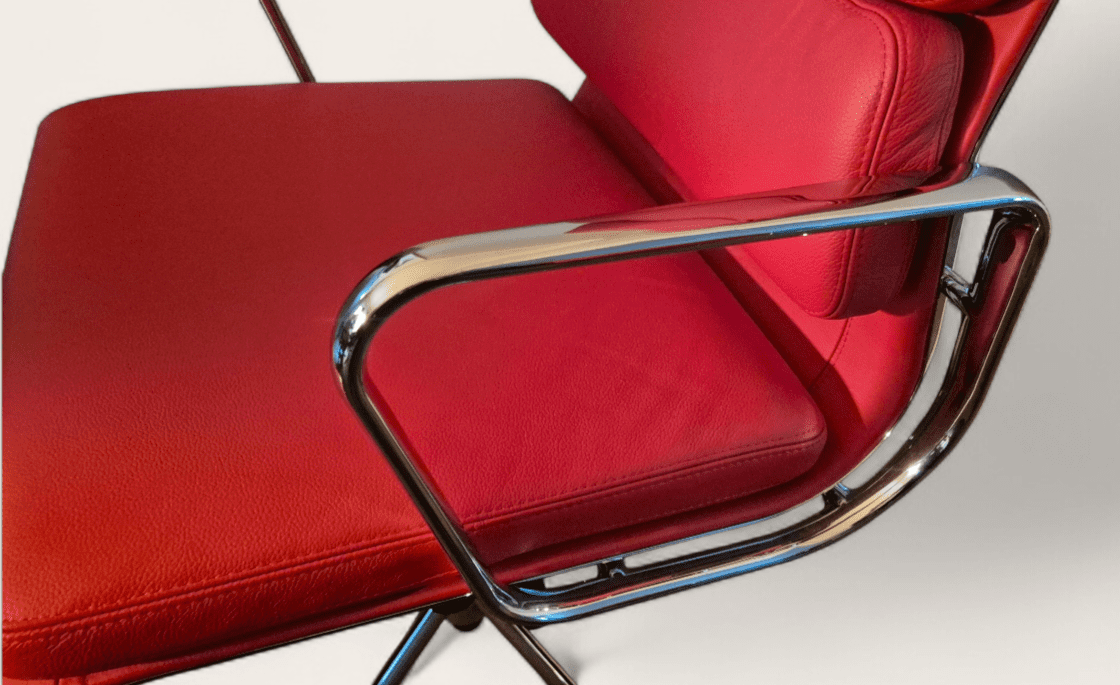 9Rot auf verchromtem Aluminium — diese Kombination ist unter Sammlern und Designkennern die begehrteste der gesamten Soft-Pad-Familie, weil sie den Raum sofort definiert, ohne ihn zu überwältigen. Wer einen EA 219 in Rot sucht, wartet beim Händler oft Monate. Hier sind gleich zwei originalgeprüfte Stücke verfügbar, gekauft 2019 — also aktuelle Generation, Leder Premium F in vollem Saft. Neupreis bei Vitra-Fachhändlern: ab 5765,00€ pro Stück — hier für € 3.765,00; Ersparnis 2.000,00€