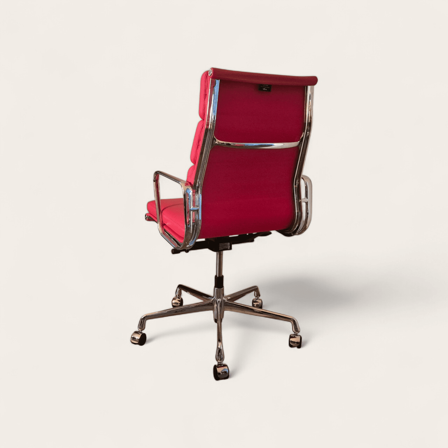 Charles und Ray Eames entwickelten die Aluminium Group ab 1958 — zunächst für den Außenbereich, schnell aber zum einflussreichsten Bürostuhl des 20. Jahrhunderts. 1969 folgte die Soft Pad Group: Dieselbe schlanke Aluminiumkonstruktion, ergänzt um aufgenähte Lederpolster, die Komfort und Repräsentanz steigern, ohne die Eleganz der Silhouette zu brechen. Der EA 219 ist das großformatige Flaggschiff dieser Familie — mit hoher Rückenlehne und einer Präsenz, die im Raum sofort wahrgenommen wird. Vitra ist der einzige lizenzierte Hersteller der Eames-Designs für Europa und den Nahen Osten und gewährt eine 30-jährige Garantie auf alle Soft-Pad-Modelle.