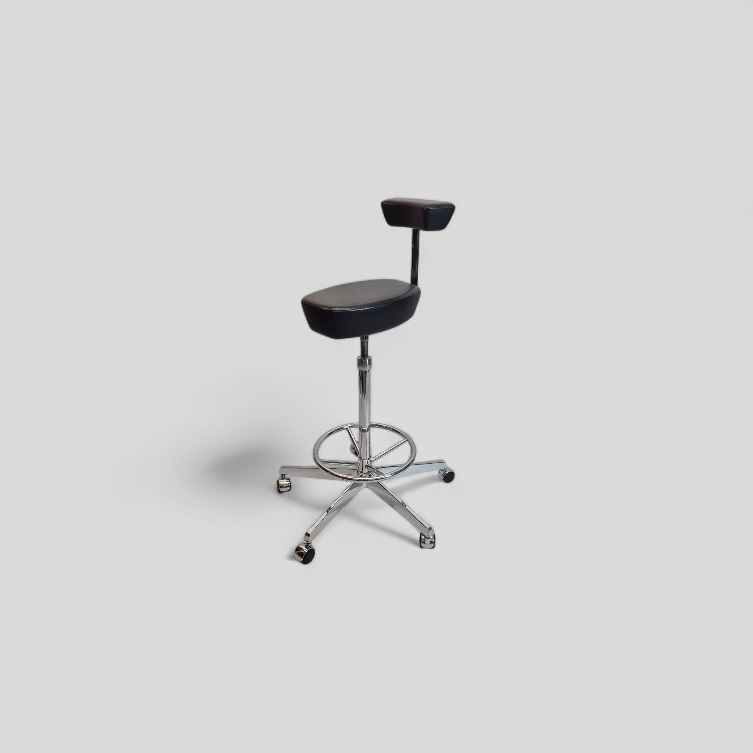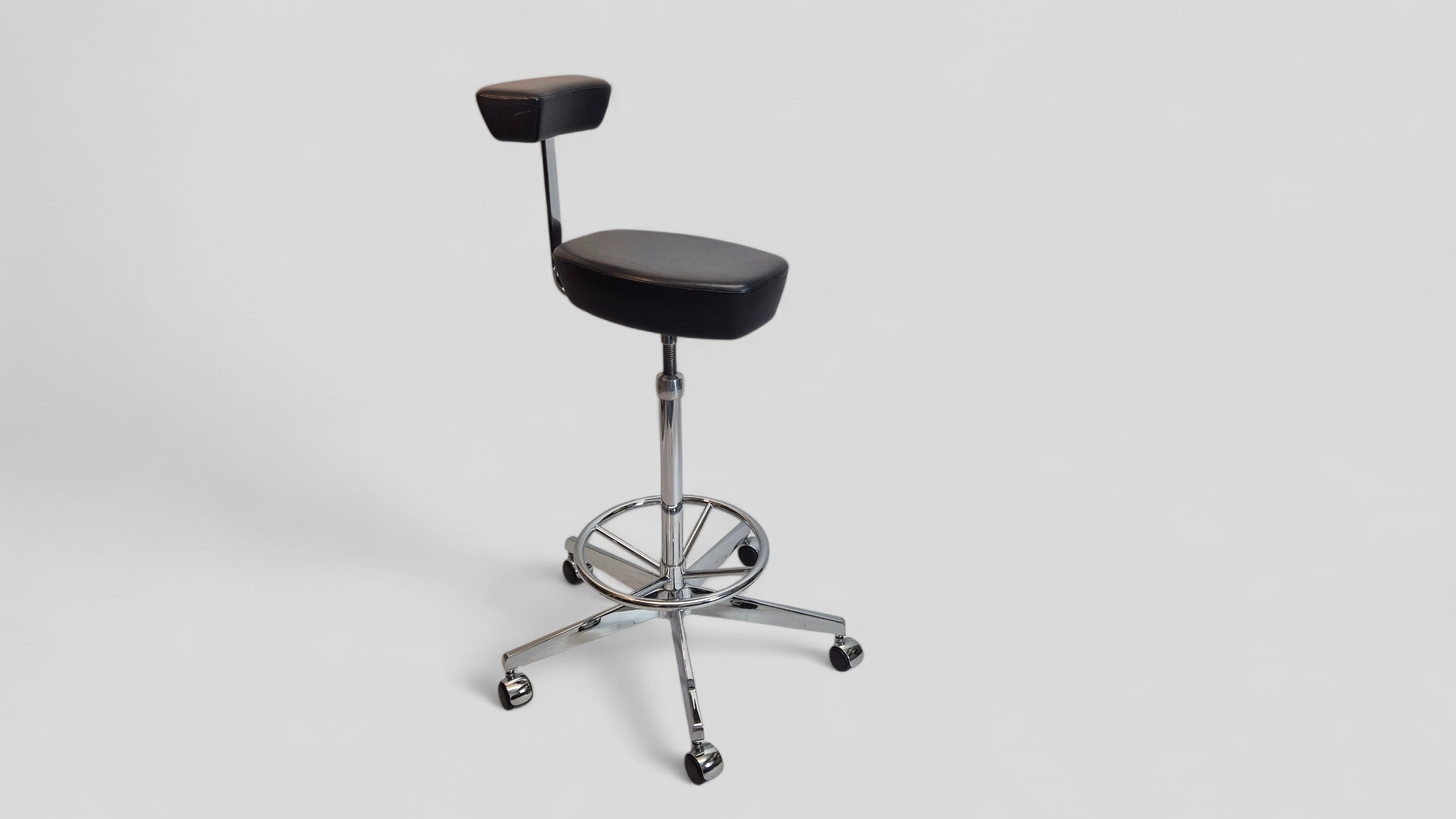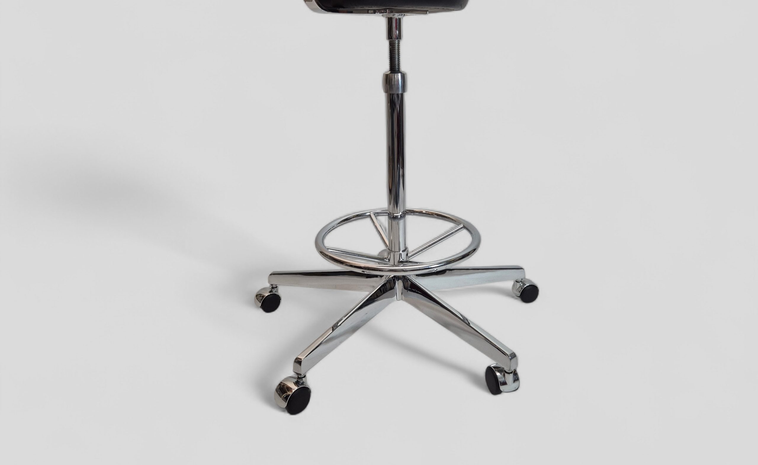 Schwarzes Leder, verchromtes Stahlgestell, höhenverstellbar über Spindel — der Nelson Perch ist ein beliebter Vitra-Klassiker. Der Neupreis bei Vitra liegt aktuell bei ca. €1.690 pro Stück — hier für €390, versandkostengünstig.